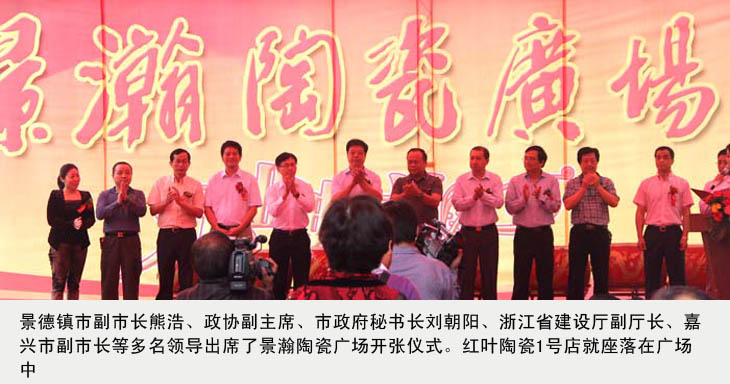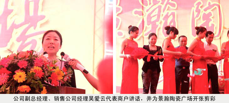 在景瀚陶瓷廣場(chǎng)落成開業(yè)慶典儀式上,公司副總吳愛云受王耀董事長委托,代表景德鎮(zhèn)陶瓷股份有限公司,代表紅葉陶瓷1號(hào)店,代表所有進(jìn)駐的業(yè)主們發(fā)言。她說:今天是五星級(jí)陶瓷購物天堂——景瀚陶瓷廣場(chǎng)開業(yè)的大好日子,受王耀董事長委托,我僅代表景德鎮(zhèn)陶瓷股份有限公司,代表紅葉陶瓷1號(hào)店,代表所有進(jìn)駐的業(yè)主們,對(duì)景翰陶瓷廣場(chǎng)的開業(yè)表示熱烈的祝賀。祝景瀚陶瓷廣場(chǎng)開業(yè)大吉,生意興隆。