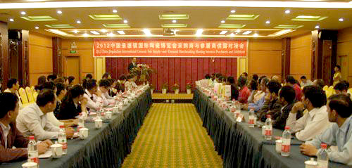 10月18日下午,由瓷博會(huì)、省陶瓷公司主辦的“2012年中國(guó)景德鎮(zhèn)國(guó)際陶瓷博覽會(huì)采購(gòu)商與參展企業(yè)對(duì)接會(huì)”在開(kāi)門子三樓會(huì)議室舉行。來(lái)自10余個(gè)國(guó)家的40家采購(gòu)商以及由瓷博會(huì)根據(jù)采購(gòu)需求挑選出來(lái)的55家參展商參加了此次對(duì)接會(huì)議。副市長(zhǎng)張春萍出席會(huì)議并致辭。