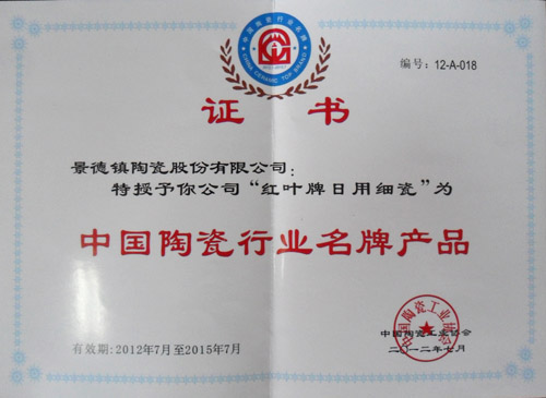 經(jīng)過嚴格的評定,中國陶瓷工業(yè)協(xié)會近期公布了最新的“2012中國陶瓷行業(yè)名牌產(chǎn)品”榮譽榜單。經(jīng)過數(shù)輪的激烈角逐評選,公司 “紅葉”牌日用陶瓷名列榜單。