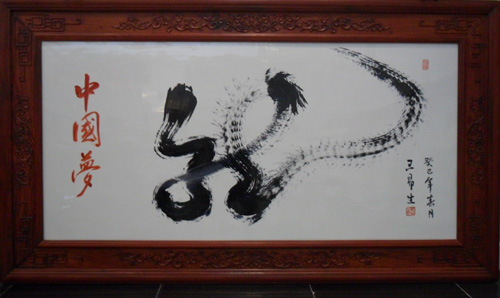 在當天的活動中,王易生的草書一筆龍,已達到了較高的藝術境界,其一氣呵成的書寫方式在書畫界更是一絕?!褒垺弊值那安肯笳髦腥A兒女祈福納祥,國泰民安;中部象征著中華大地改革之勢,波瀾壯闊;尾部象征著中華民族偉大復興、巨龍騰飛、正當其時?!褒埼病保乞v龍奔逐,奇幻莫測,給人極強的心靈震撼。