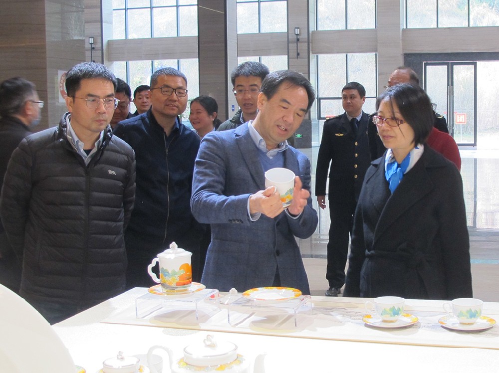 在國瓷館參觀考察期間,周敏建向調研組一行簡要介紹了集團公司發(fā)展歷程。大家邊走邊看,不時駐足拿起產品仔細品鑒或拍照。周敏建在介紹“國瓷紅葉”產品特色時詳細講解了陶瓷生產工藝,講述了一套套有關“國瓷”的故事。