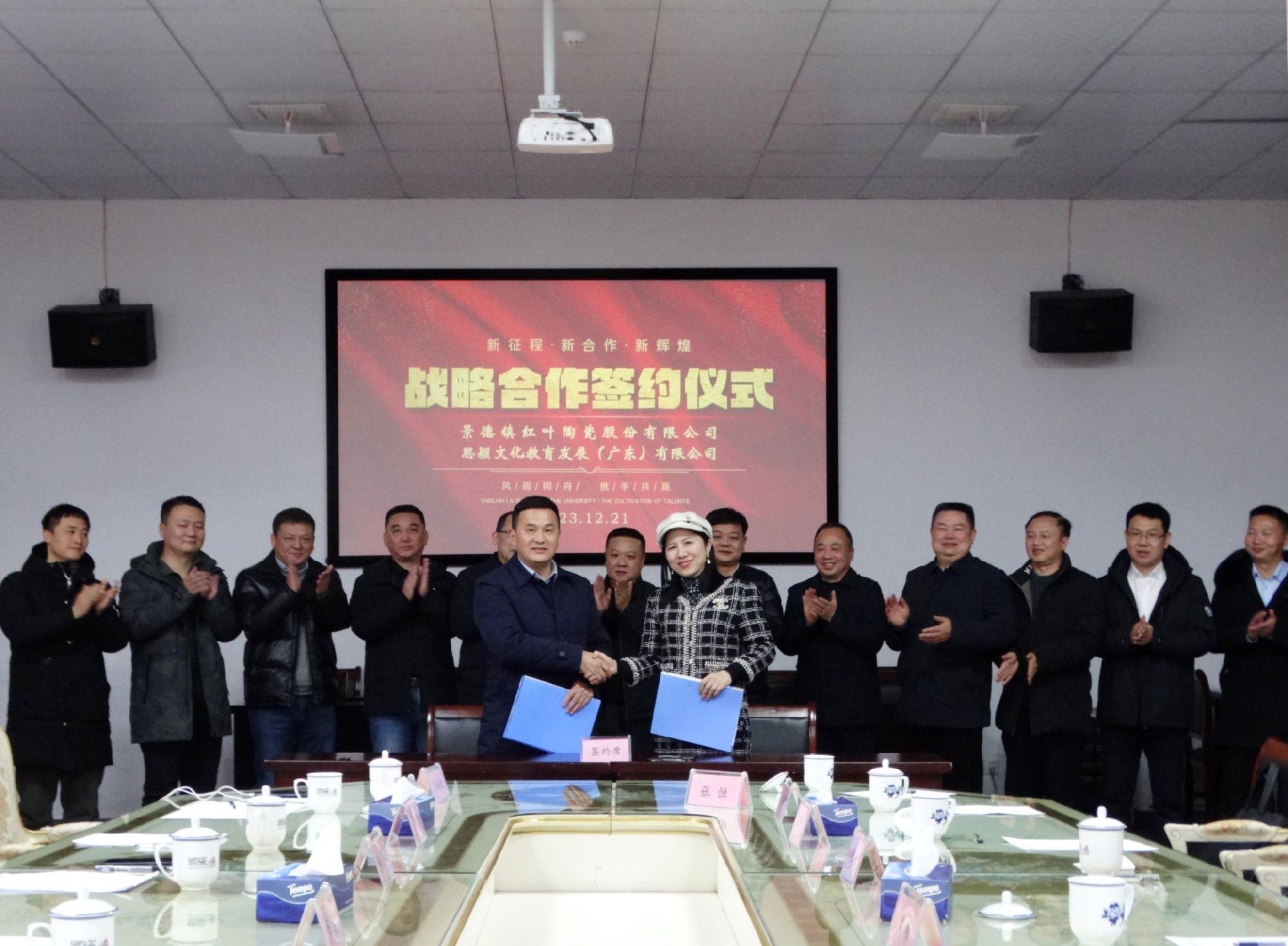 會(huì)上,景陶集團(tuán)分別與河南三元光電科技有限公司、思穎文化教育發(fā)展(廣東)有限公司簽署了戰(zhàn)略框架協(xié)議。并授權(quán)張新先生擔(dān)任紅葉陶瓷全球文化推廣大使。
